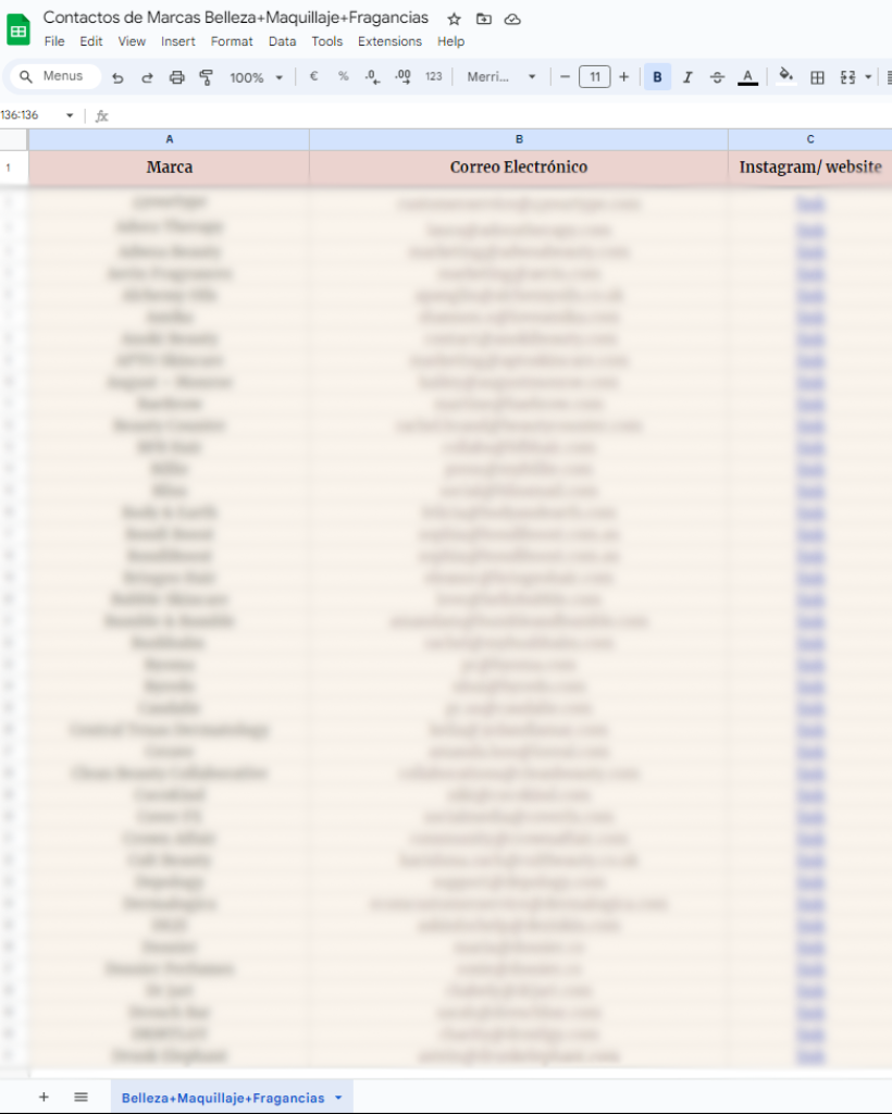 El Google Sheet está diseñado para ser una herramienta práctica, intuitiva y fácil de usar, permitiéndote buscar y filtrar marcas según tus necesidades específicas. Las categorías cubren una amplia gama de industrias, como belleza, maquillaje y fragancias. Esta diversidad garantiza que puedas encontrar las marcas más relevantes para tu nicho, maximizando tus oportunidades de colaboración.