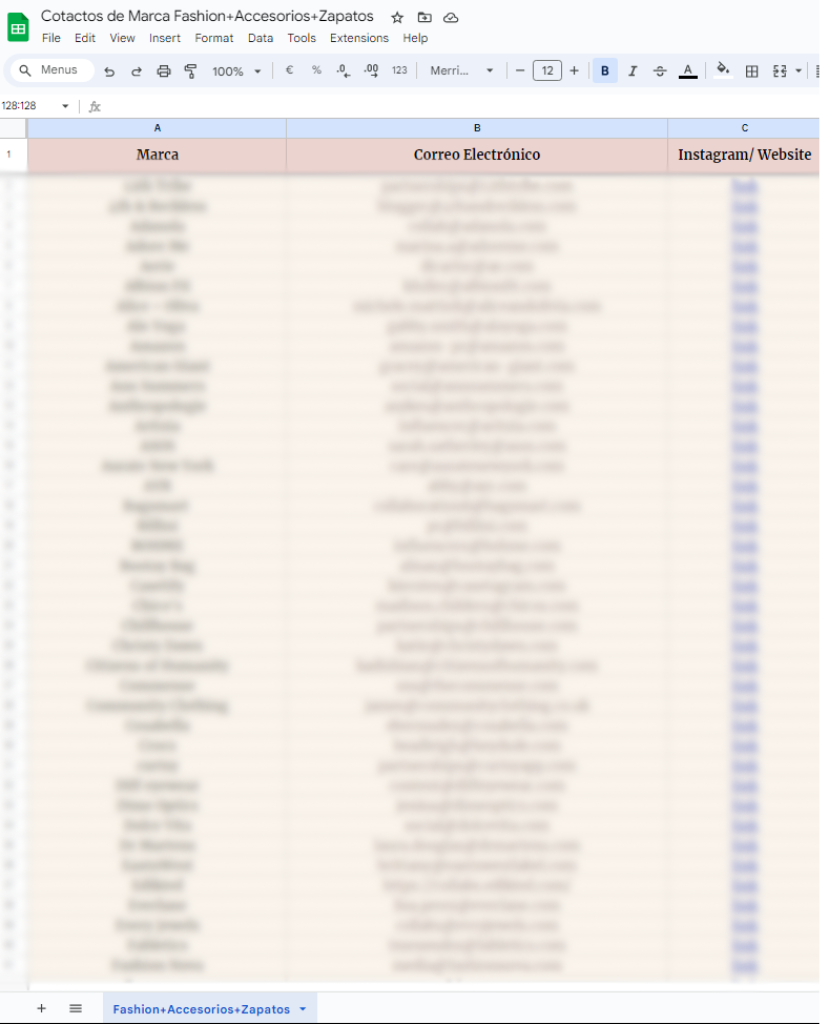 El Google Sheet está diseñado para ser una herramienta práctica, intuitiva y fácil de usar, permitiéndote buscar y filtrar marcas según tus necesidades específicas. Las categorías cubren moda, accesorios y zapatos. Esta diversidad garantiza que puedas encontrar las marcas más relevantes para tu nicho, maximizando tus oportunidades de colaboración.